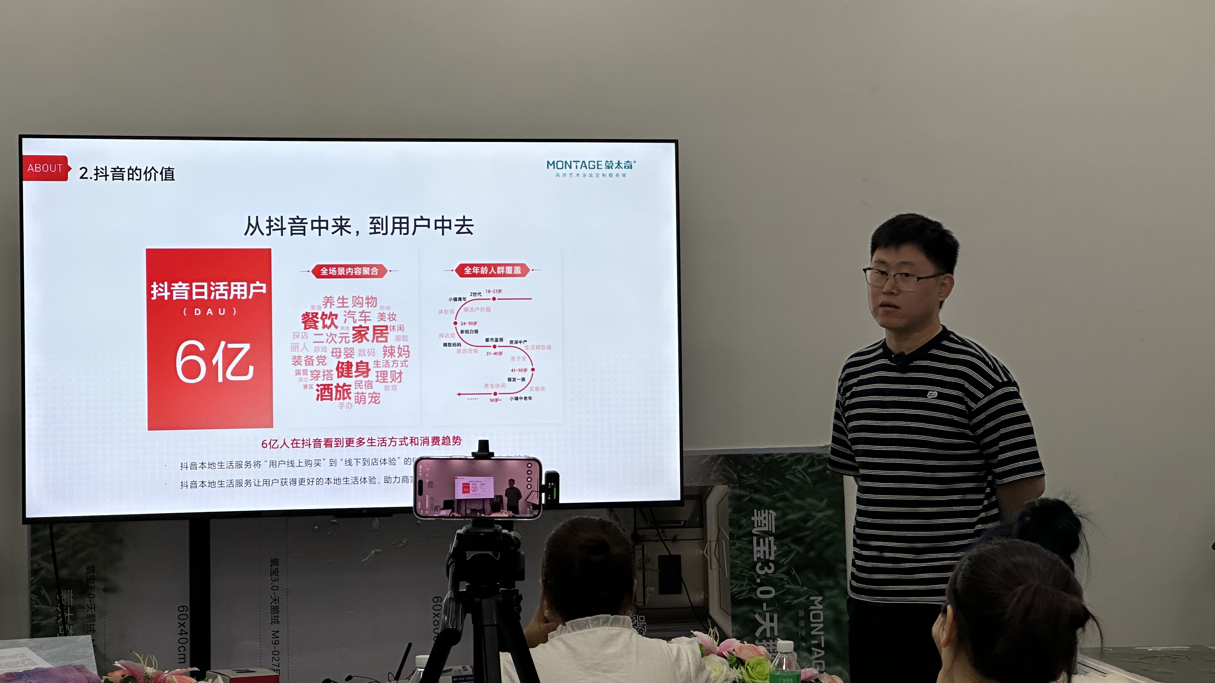 在最后一天下午的培訓中,有著“藝術涂料最美老板娘”之稱的蒙太奇品牌聯(lián)合創(chuàng)始人呂芳方女士與大家分享了抖音直播的心得與體會,以自己成長的實操歷程從公司的戰(zhàn)略布局與終端門店經營的必要性與重要性等方面全面闡述了抖音直播與短視頻運營的意義與價值。