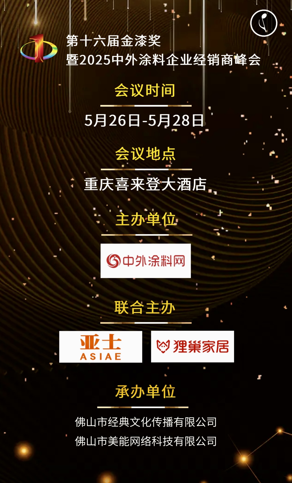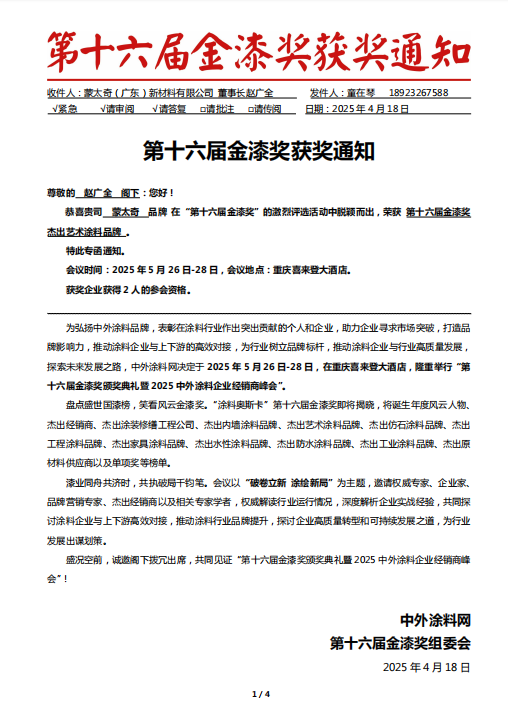 第十六屆金漆獎(jiǎng)?lì)C獎(jiǎng)典禮暨2025中外涂料企業(yè)經(jīng)銷(xiāo)商峰會(huì)于2025年5月26日—28日,在重慶喜來(lái)登大酒店盛大啟幕。蒙太奇受邀出席,將與行業(yè)同仁共探發(fā)展新機(jī)遇。此次榮膺金漆獎(jiǎng),對(duì)于蒙太奇而言既是行業(yè)權(quán)威的至高認(rèn)可,也是品牌承諾責(zé)任的新起點(diǎn)。誠(chéng)邀全國(guó)經(jīng)銷(xiāo)商伙伴、消費(fèi)者關(guān)注頒獎(jiǎng)盛會(huì),共同見(jiàn)證品牌榮耀時(shí)刻。