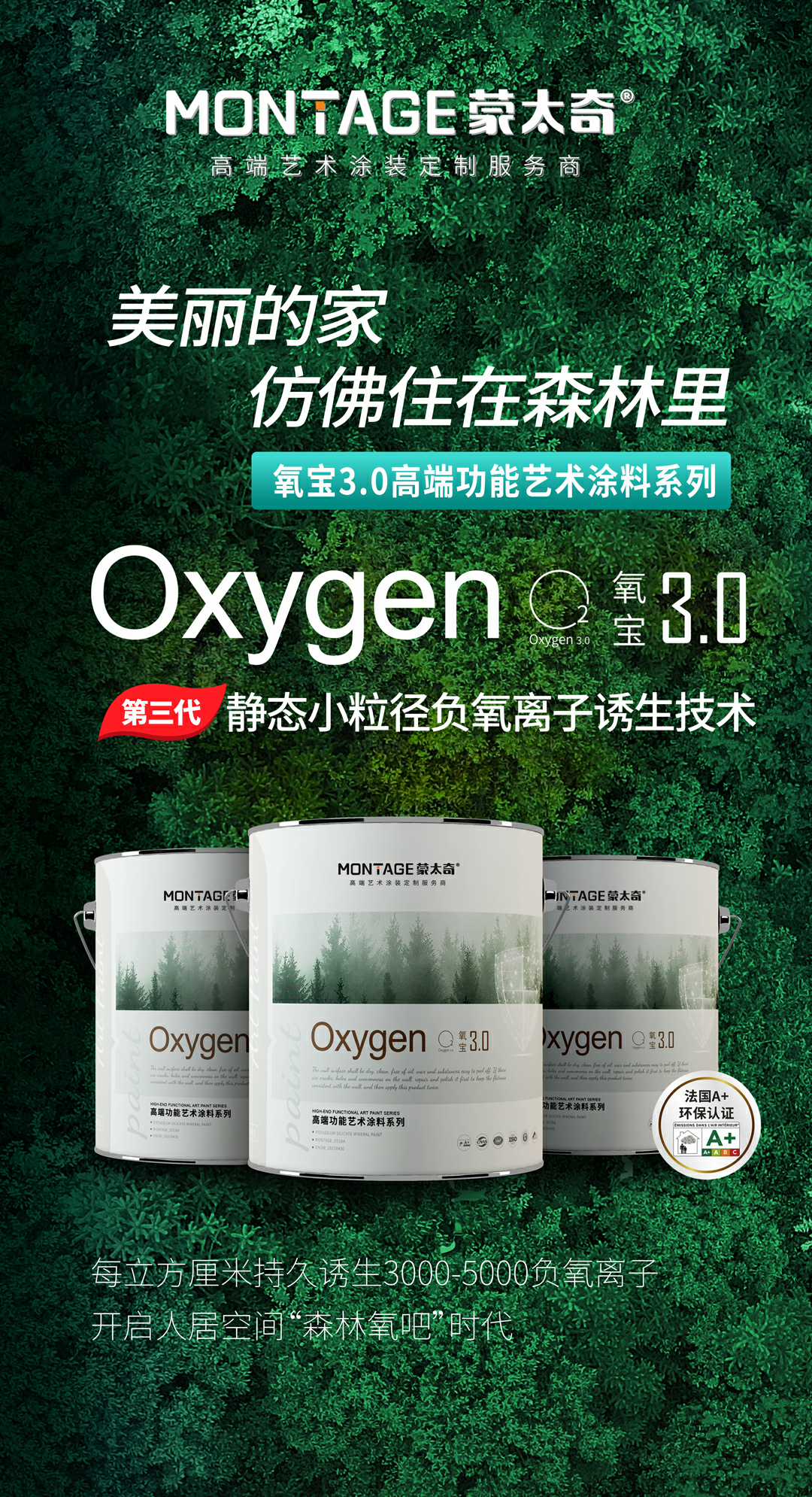 蒙太奇氧寶3.0系列搭載“第三代靜態(tài)負氧離子誘生技術”,能持久釋放負氧離子,其負氧離子含量與誘生量均通過國家檢測中心認證。具有優(yōu)異的殺菌除味效果,沉降PM2.5、改善亞健康的功能,相當于將森林氧吧搬入家中。