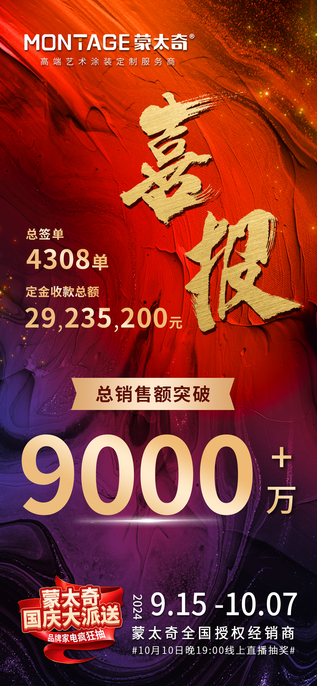 2024年9月15日-10月7日,蒙太奇“國慶大派送”活動以斐然成績圓滿落下帷幕?;顒悠陂g,蒙太奇全國各大區(qū)終端門店積極參與,通過線上與線下多元化渠道的全方位推廣,大單喜報不斷,并贏得了廣大消費者的高度贊譽。在此期間,不僅順利超額完成了預(yù)設(shè)目標,接單量更是再創(chuàng)新高,彰顯了蒙太奇卓越的市場影響力和品牌實力。