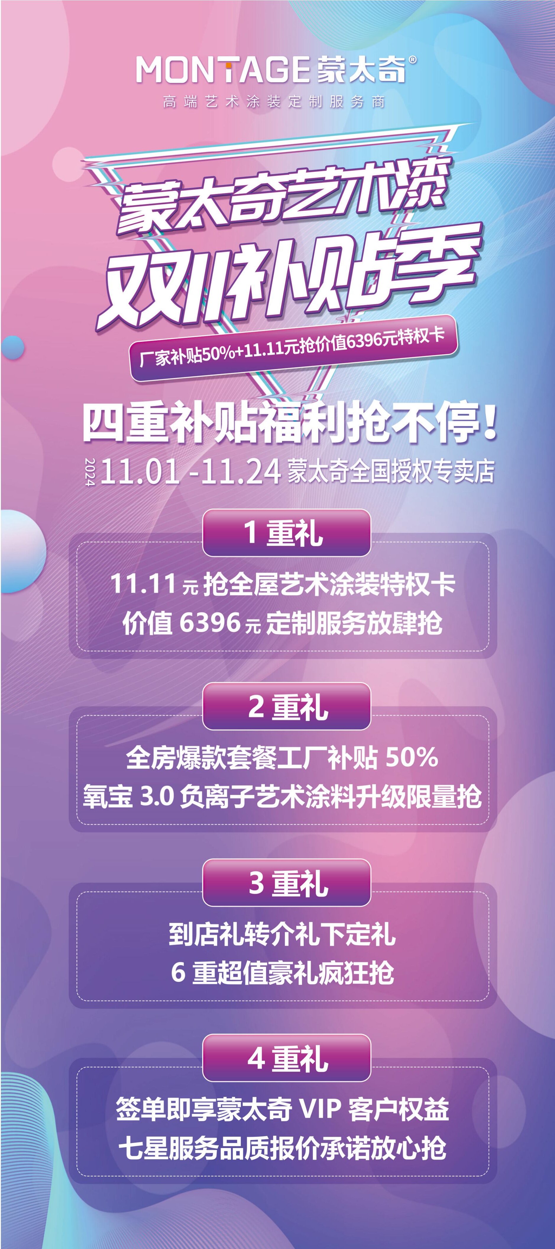 蒙太奇此次雙11補貼季全國大促,緊跟國家家居建材綠色產(chǎn)品補貼腳步,推出四重補貼優(yōu)惠政策,最高直補50%,更推出“全屋藝術(shù)涂裝定制特權(quán)卡”服務(wù),活動期間,只需11.11元即可享受6396元的高端定制服務(wù),讓消費者切實感受到了鉅惠風暴力度,真正做到了全屋藝術(shù)涂裝煥新超級??!