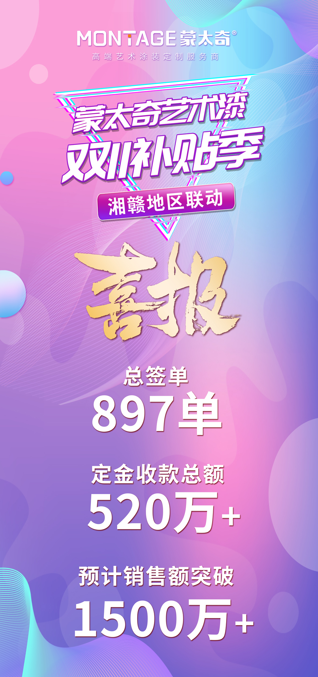 11月1日至24日,蒙太奇雙11補貼季活動圓滿落下帷幕。在此次大促活動中,湘贛區(qū)域再度聯(lián)手,取得了耀眼佳績,累計簽單897單,定金收款總額520萬+,預計銷售額突破1500萬+,這是湘贛區(qū)域繼蒙太奇十一全國大促活動以來再次取得銷售佳績。